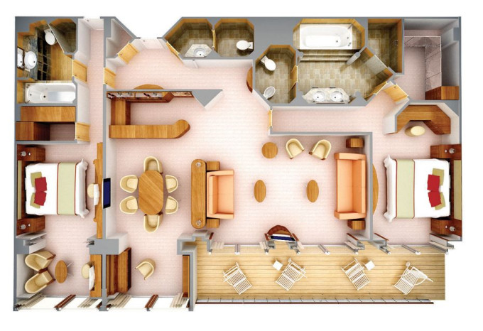 R2 - Royal Suite 2 127 m² (vrátane 18 m² balkónov). Royal Suite prepojená s Veranda Suite. 7. paluba vpredu. Max 5 osôb. 69 900 € 23 300 € za osobu