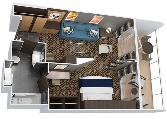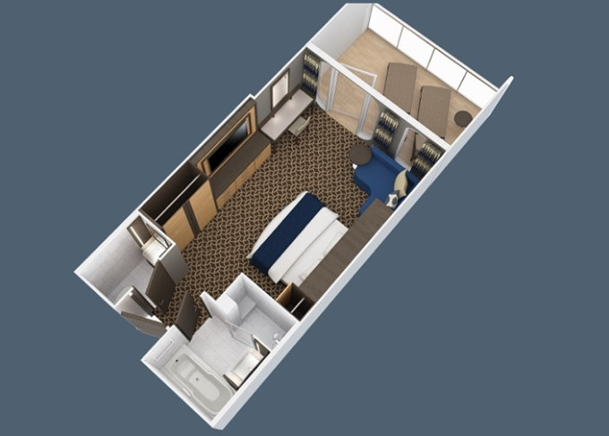| 1U - Vnútorná kajuta s virtuálnym balkónom 15,5 m². Obrazovka veľkosti balkónových dverí s premietaným výhľadom. Centrálne umiestnenie. Max 3-4 osoby. | 2 872 € 718 € za osobu | ||
