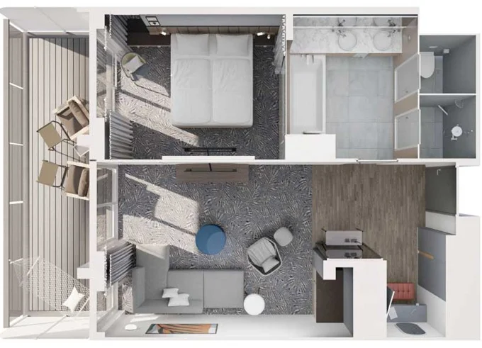 JKCO - Junior Suite s balkónom C 26 m² + balkón 7 m² so stoličkami a podnožkami. 7. paluba. Max 4 osoby. Výhody Junior Suite. 8 218 € 4 109 € za osobu